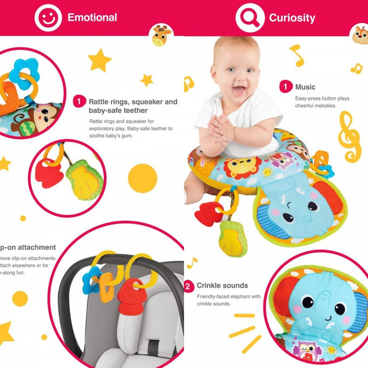 اسباب بازی بالشت گردنی طرح فیل وین فان می تواند یک همراه سرگرم کننده و جذاب برای کودک شما باشد. بالشت گردنی طرح فیل موزیکال بوده و زمان بازی روی شکم و دراز و نشست قابل استفاده است و دارای ملودی های جذاب و دوست داشتنی است. فاقد مواد شیمیایی و مضر است