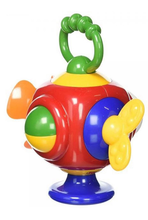 کودک با کشیدن دسته، توپ شروع به چرخش می کند. با فشار دادن دکمه ی سفید، صدا تولید می کند.