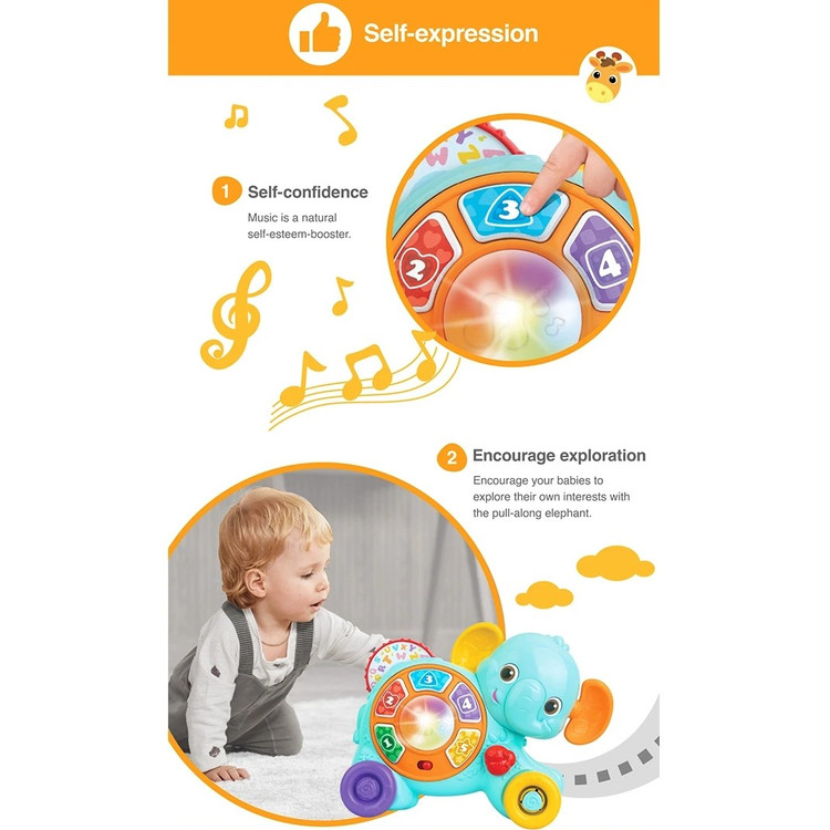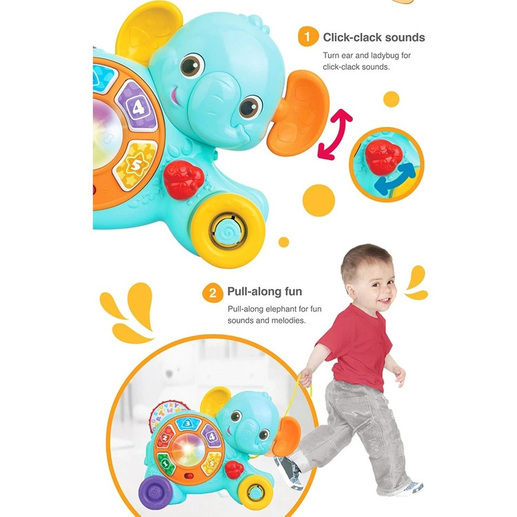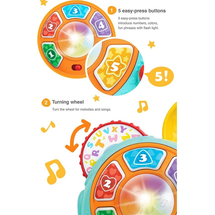 موزیکال دارای 5 کلید با قابلیت پخش موزیک، اعداد و حروف انگلیسی دارای افکت های نوری رنگی دارای چرخ دنده برای تغییر ملودی ها دارای چرخ و بند جهت حمل و بازی راحت کودک دارای دکمه روشن خاموش ملودی دارای گوش هایی با قابلیت چرخشی و کفش دوزک صدادارچ