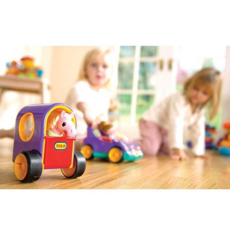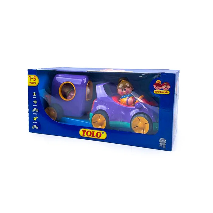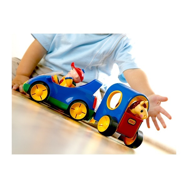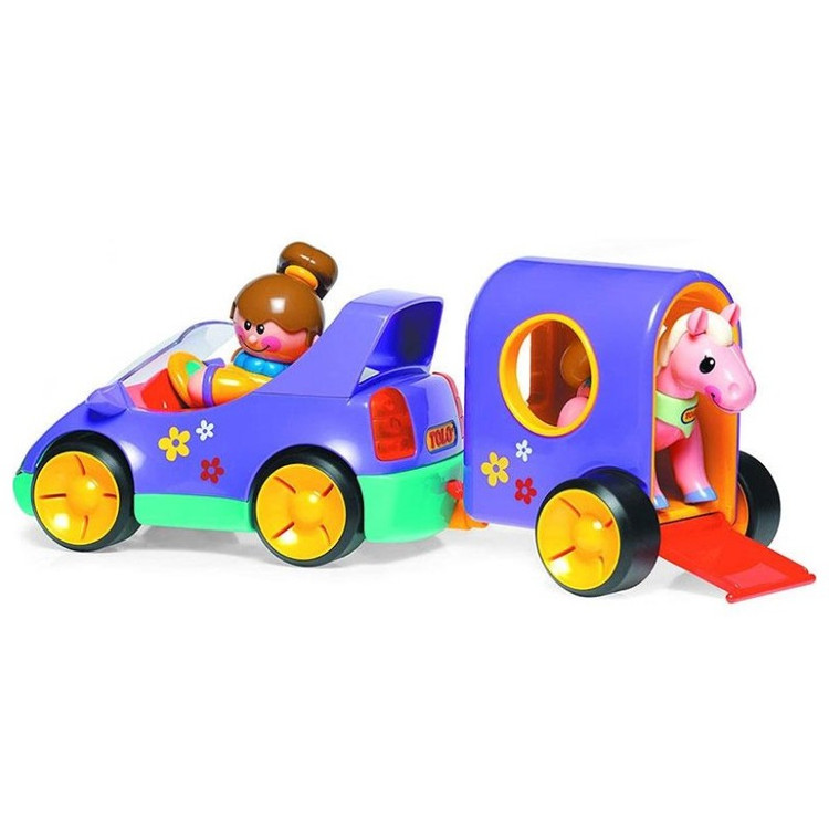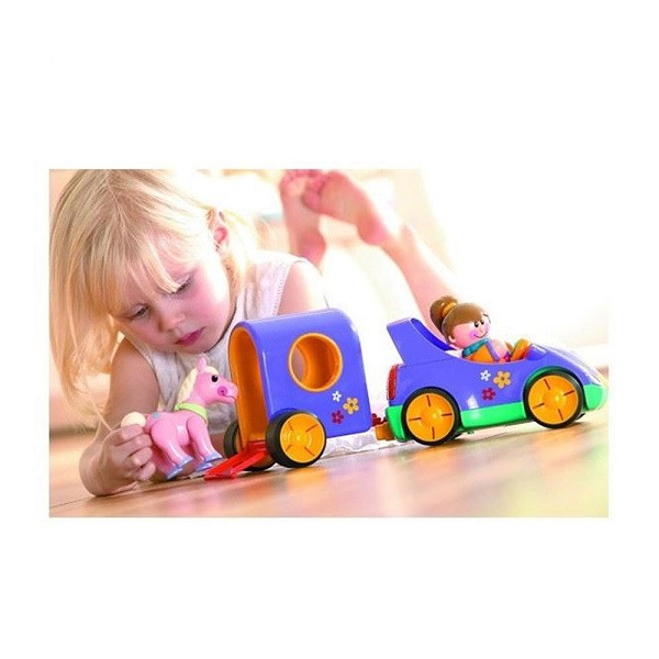 این مجموعه شامل یک ماشین، یدک کش، اسب اسباب بازی و آدمک دختر است