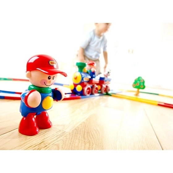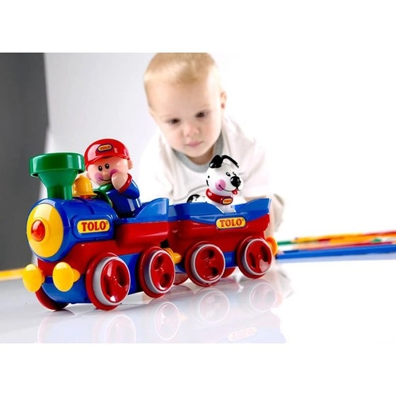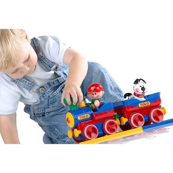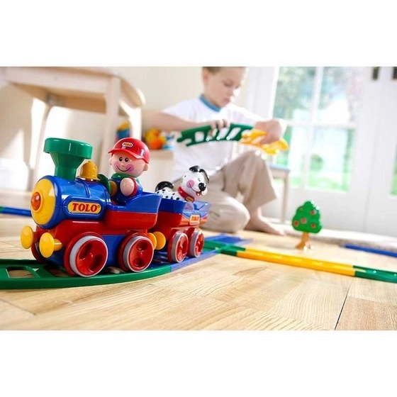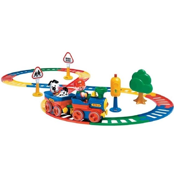 قطار اسباب بازی با علائم کامل تولو شامل یک قطار با آدمک راننده، یک عروسک سگ، یک درخت سیب، یک چراغ راهنمایی، دو علامت راهنمایی و رانندگی و همچنین 17 قطعه ریل است.