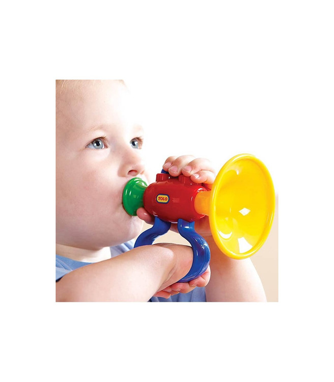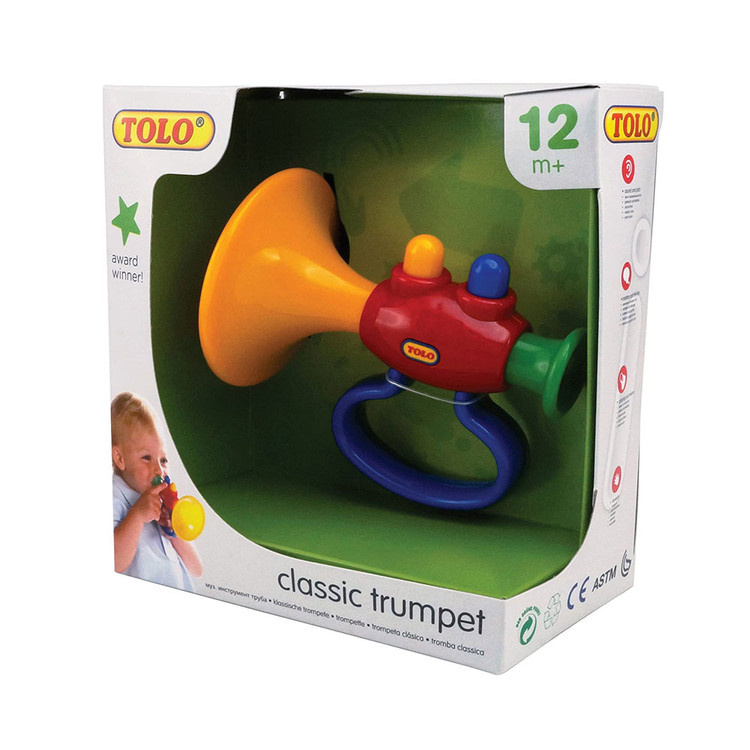 اسباب بازی شیپور تولو (Tolo Toys Classic Trumpet) یک اسباب بازی جهت تقویت عضلات قفسه سینه و صورت نوزاد است. در استفاده از این اسباب بازی کودک میتواند با دمیدن در قسمت ورودی شیپور عضلات صورت و سر خود را تقویت کند. تولید صدا های مختلف توسط این اسباب بازی میتواند باعث ایجاد هیجان در کودک شود. با توجه به اینکه تولید صدا برای کودکان بسیار جذاب است این اسباب بازی میتواند در تقویت مهارت های شنیداری کودک نیز بسیار تاثیر گذار باشد. با استفاده از این اسباب بازی والدین میتوانند علاقه ی کودک به آلات موسیقی را نیز بررسی کنند.