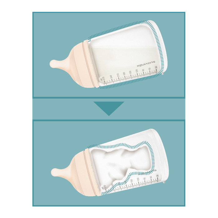 • این شیشه دارای یک محفظه سیلیکونی ضد کولیک داخل شیشه شیر است که هنگام نوشیدن شیر توسط نوزاد ، کم کم منقبض شده و جمع میشود و نوزاد در این حالت نوزاد هوای اضافی را نمی بلعد و دچار دل درد و کولیک نمی شود