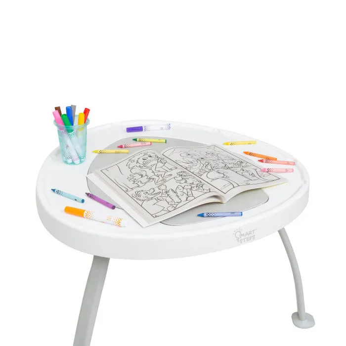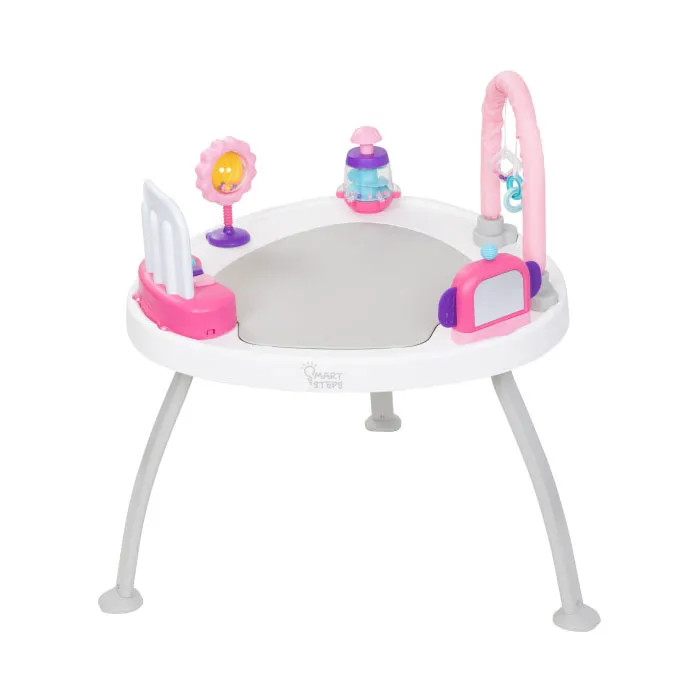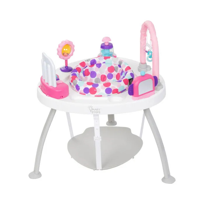 میز چند منظوره Baby Trend 3-in-1 Bounce N’ Play PLUS که برای رشد کودک طراحی شده است، به راحتی از یک جامپر، به یک میز بازی ، سپس به یک میز مسطح برای نقاشی یا کارهای دیگر تبدیل می شود. میز توسط پایه های مستحکم 3 تایی نگهداری میشود که والدین می توانند با تماشای بازی کودکان خود در حین یادگیری، خیالشان راحت باشد. تقویت حس کنجکاوی کودک با صندلی چرخان 360 درجه، تخته جهشی و اسباببازیهای قابل جابجایی که میتوان آنها را حرکت داد.تخته جامپر دارای سه حالت تنظیم ارتفاع است که می تواند وزن و حرکت بدن کودک شما را پشتیبانی کند و همچنین به او کمک کند تا ایستادن روی نوک انگشتان پا را یاد بگیرد. پنج اسباب بازی با طراحی منحصر به فرد به میز وصل شده اند تا کودکان بتوانند در حین بازی یاد بگیرند. همچنین هماهنگی دست و چشم، قدرت تمرکز و رشد مغز را بهبود می بخشد. اسباب بازی ها قابل جابجایی هستند و می توان از آنها به عنوان اسباب بازی مستقل استفاده کرد. با رشد کودک، میز چندکاره Baby Trend Bounce N’ Play PLUS می تواند به یک میز صاف تمیز و محکم برای بازی، خواندن، رنگ آمیزی و موارد دیگر تبدیل شود. مرکز فعالیت برای نوزادان 4 ماهه به بالا طراحی شده است.
