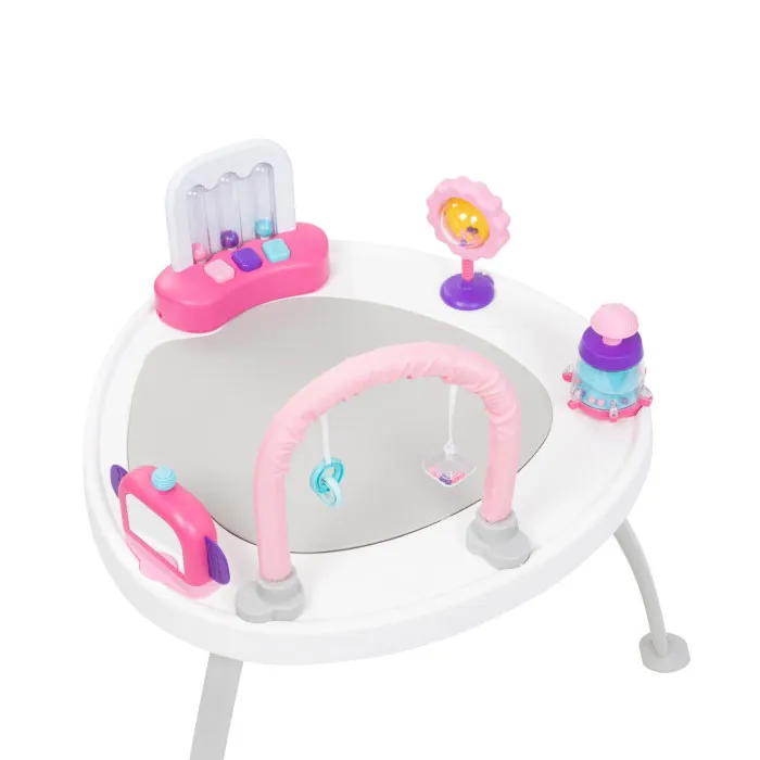 میز چند منظوره Baby Trend 3-in-1 Bounce N’ Play PLUS که برای رشد کودک طراحی شده است، به راحتی از یک جامپر، به یک میز بازی ، سپس به یک میز مسطح برای نقاشی یا کارهای دیگر تبدیل می شود. میز توسط پایه های مستحکم 3 تایی نگهداری میشود که والدین می توانند با تماشای بازی کودکان خود در حین یادگیری، خیالشان راحت باشد. تقویت حس کنجکاوی کودک با صندلی چرخان 360 درجه، تخته جهشی و اسباببازیهای قابل جابجایی که میتوان آنها را حرکت داد.تخته جامپر دارای سه حالت تنظیم ارتفاع است که می تواند وزن و حرکت بدن کودک شما را پشتیبانی کند و همچنین به او کمک کند تا ایستادن روی نوک انگشتان پا را یاد بگیرد. پنج اسباب بازی با طراحی منحصر به فرد به میز وصل شده اند تا کودکان بتوانند در حین بازی یاد بگیرند. همچنین هماهنگی دست و چشم، قدرت تمرکز و رشد مغز را بهبود می بخشد. اسباب بازی ها قابل جابجایی هستند و می توان از آنها به عنوان اسباب بازی مستقل استفاده کرد. با رشد کودک، میز چندکاره Baby Trend Bounce N’ Play PLUS می تواند به یک میز صاف تمیز و محکم برای بازی، خواندن، رنگ آمیزی و موارد دیگر تبدیل شود. مرکز فعالیت برای نوزادان 4 ماهه به بالا طراحی شده است.