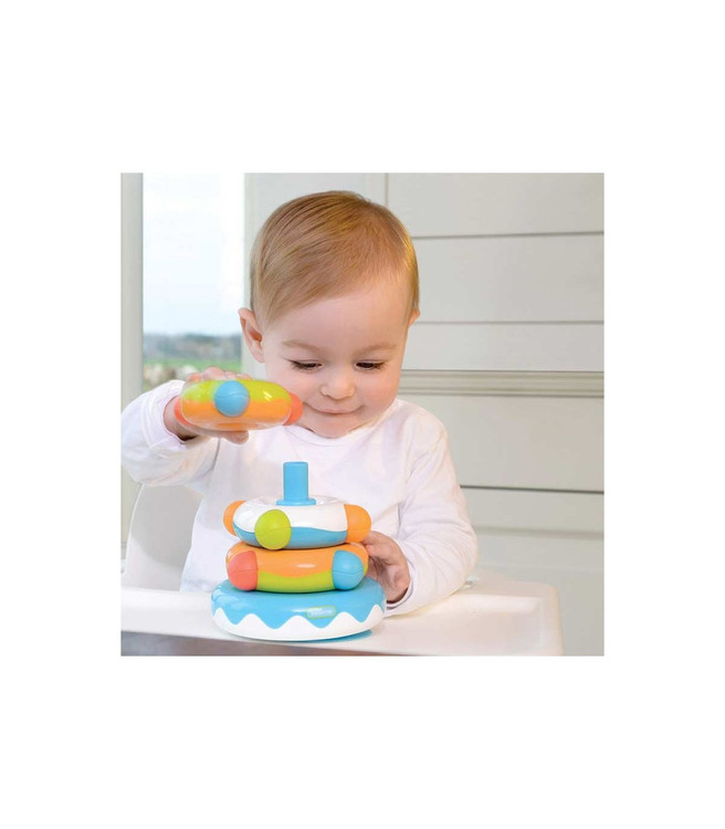 با قرار دادن حلقه ها روی هم تولید صدا میشود که هم سرگرم کننده و هم باعث تقویت شنوایی کودک میشود